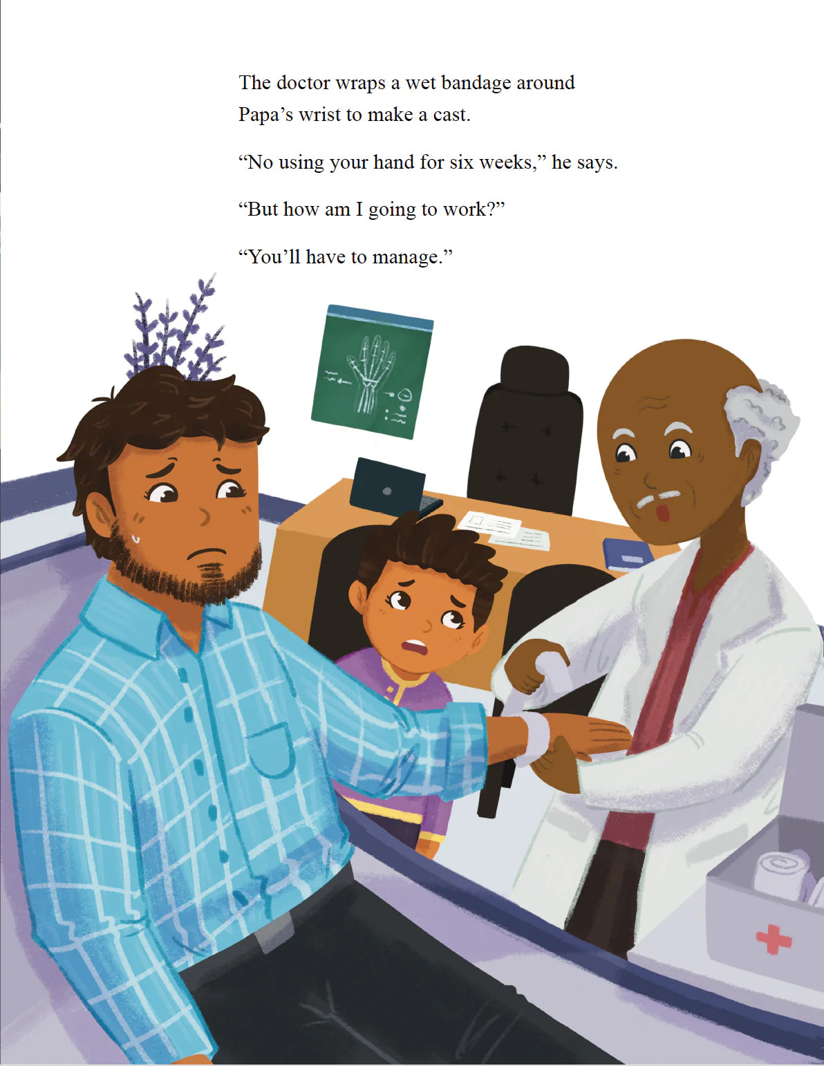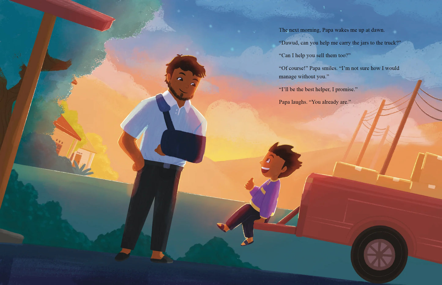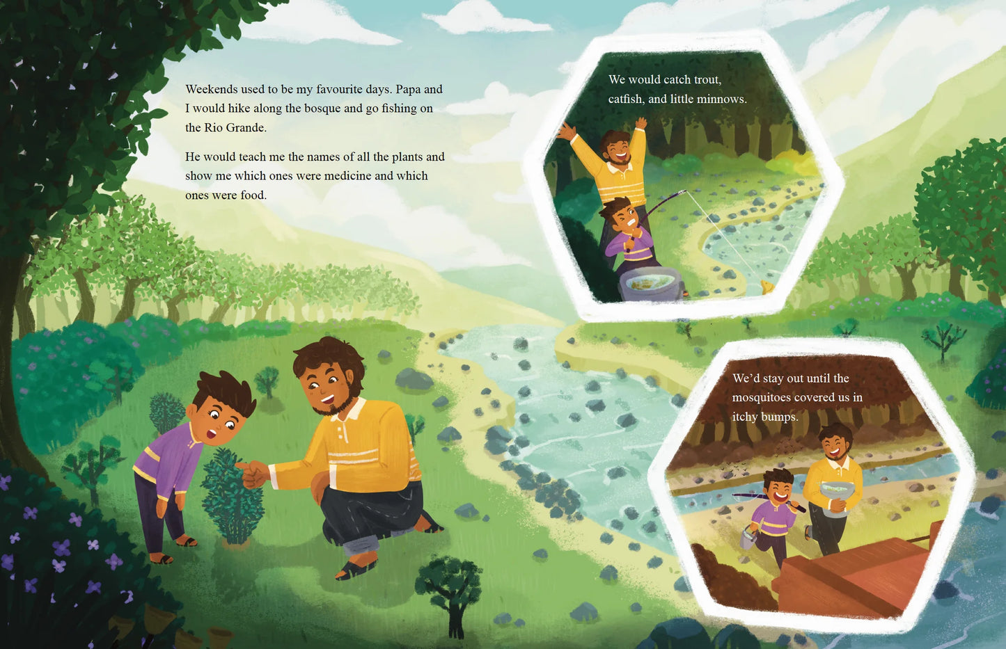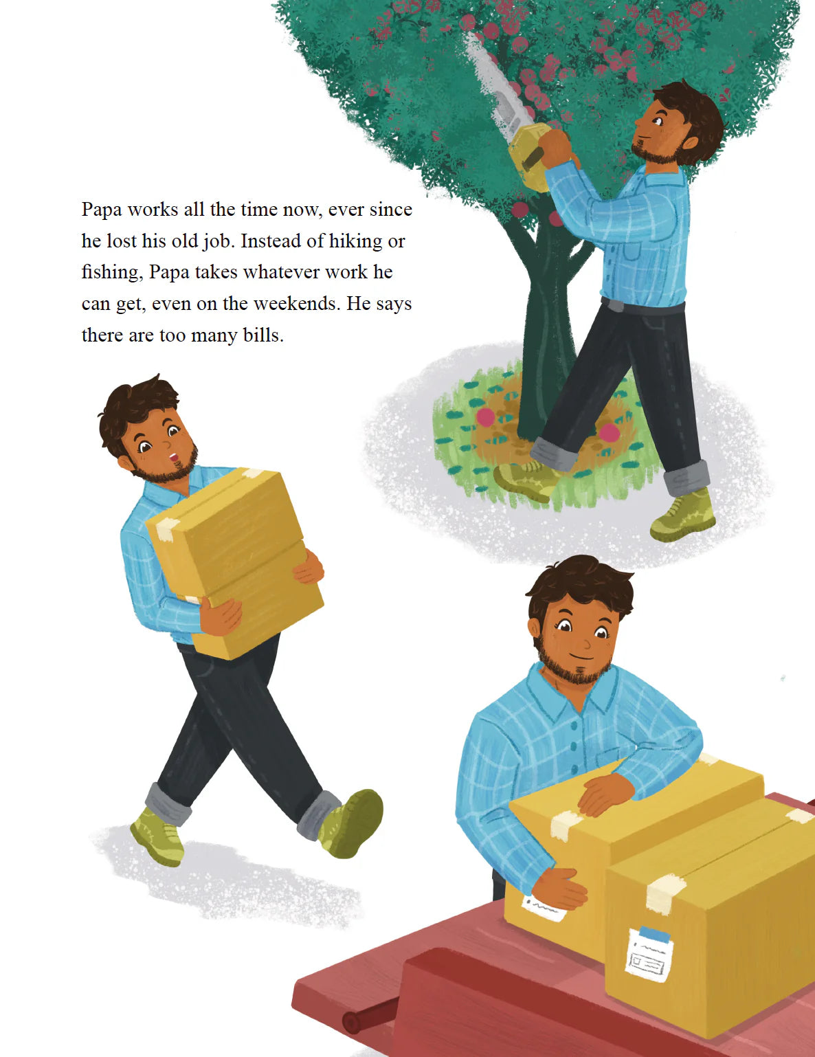 Dawud watches Papa struggle to make ends meet, and he wishes he could help. But Papa insists that he is still too young. Suddenly, Papa has an accident and can’t work. They go for a walk along the bank of the Rio Grande. On the way, Papa discovers how much Dawud has grown and how helpful he can be.