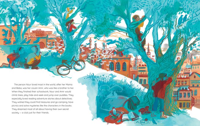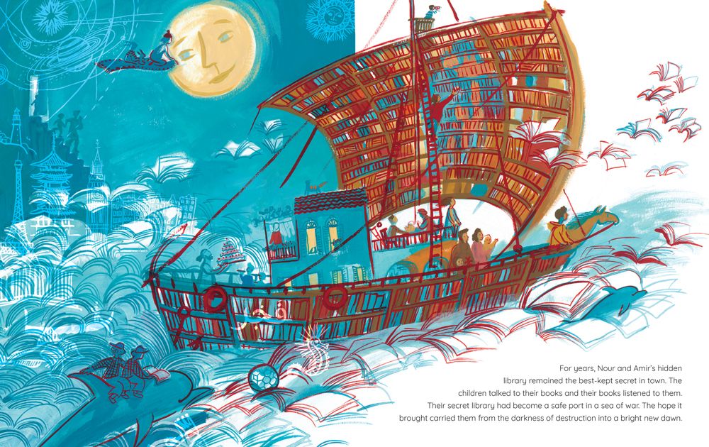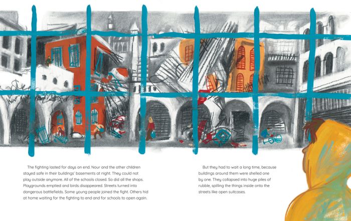 Based on the author’s own life experience and inspired by a true story, Nour’s Secret Library is about the power of books to heal, transport and create safe spaces during difficult times. Illustrations by Romanian artist Vali Mintzi superimpose the colorful world the children construct over black-and-white charcoal depictions of the battered city.