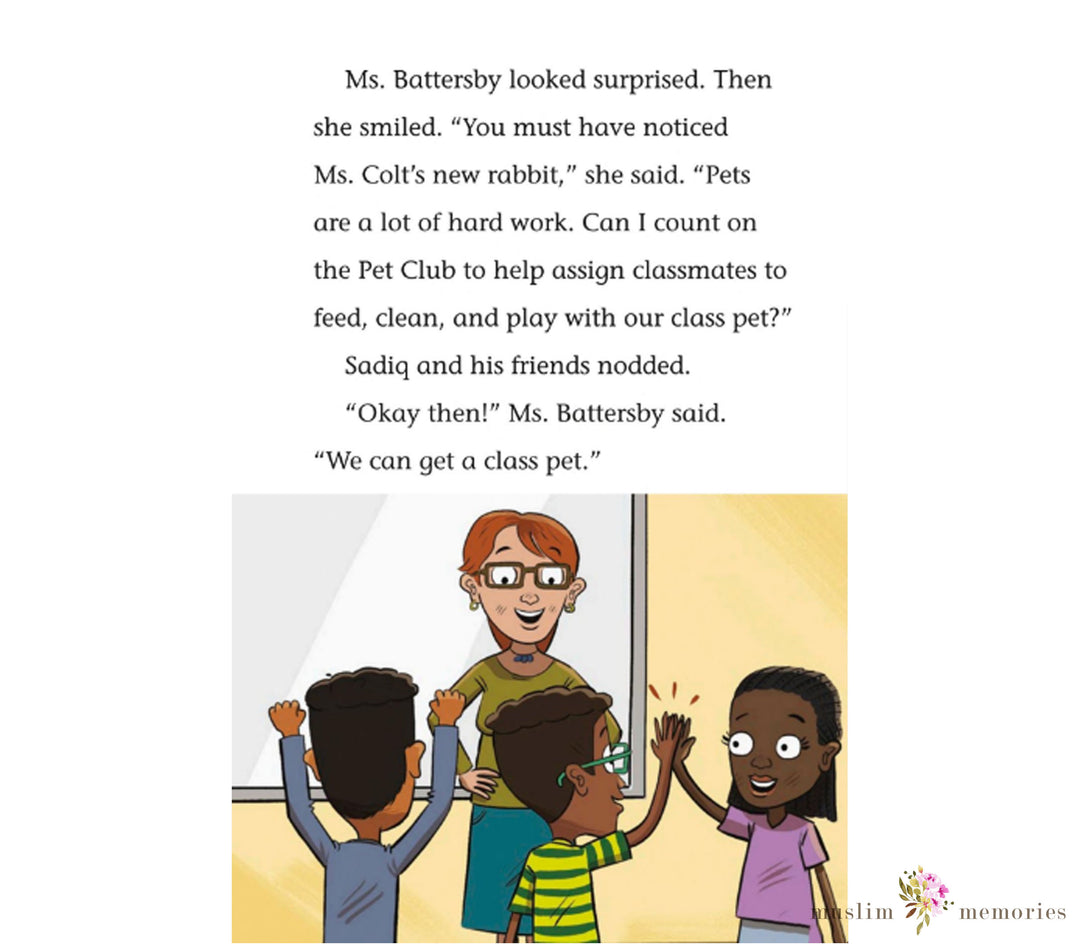Sadiq's third grade class has no classroom pet! Not only that, but Sadiq has never had a pet of his own. So Sadiq gathers some classmates to help him solve this problem. What kind of pet would be perfect for their class? A lizard? A bunny? A parakeet? Soon it's up to Sadiq and friends to convince their teacher and classmates that they have found the perfect pet match.